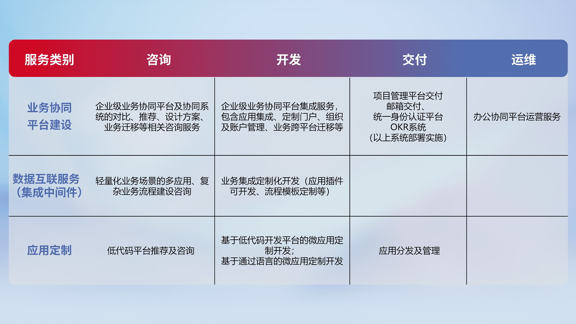 针对钉钉、、、、企微、、、IDaas等平台级产品提供产品的规划、、、、方案、、、交付、、、定制化开发等服务,,,实现如统一协同办公、、、、智能客户服务、、、、混合会议管理、、、、智能数据查询、、、、等业务场景,,实现数字化转型。。